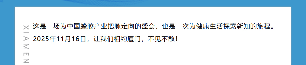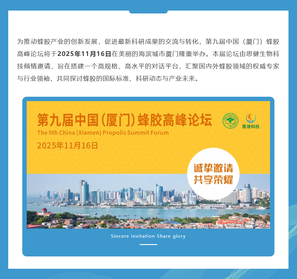 思健生物科技誠邀您共赴廈門出席第九屆中國(廈門)蜂膠高峰論壇:與蜂業(yè)權(quán)威面對面,洞見蜂膠國際新未來